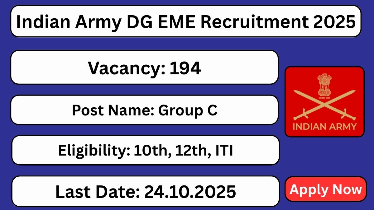 has officially announced the DG EME Recruitment 2025 notification to fill 194 Group C posts across various locations in India. Eligible candidates can apply offline through the official website www.indianarmy.nic.in.