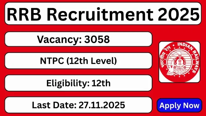 The Railway Recruitment Board (RRB) has officially announced the RRB NTPC (12th Level) Recruitment 2025 under Notification No. 07/2025. This recruitment aims to fill 3058 vacancies for Commercial Ticket Clerk, Accounts Clerk Typist, Junior Clerk Typist, and Trains Clerk positions across India. The online registration will be available from October 21, 2025, to November 27, 2025 (11:59 PM) at the official website – www.rrbapply.gov.in.