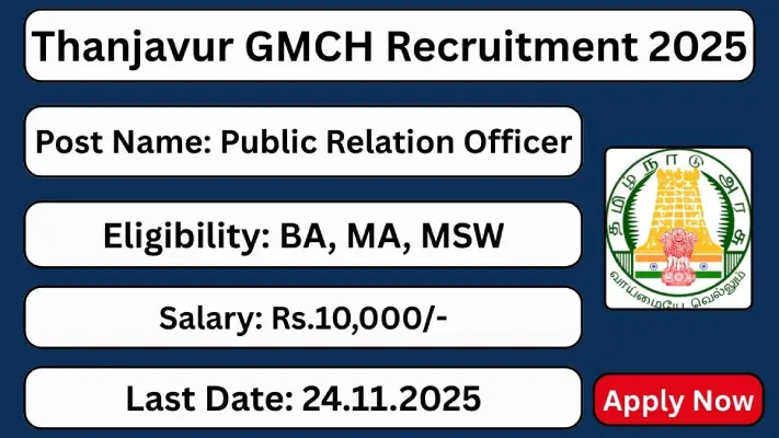 The Government Medical College & Hospital (GMCH) Thanjavur has announced the Thanjavur GMCH Recruitment 2025 for Public Relation Officer positions. Candidates interested in Tamil Nadu Government Jobs can now apply offline before the last date. Applications are open from 01.11.2025 to 24.11.2025.