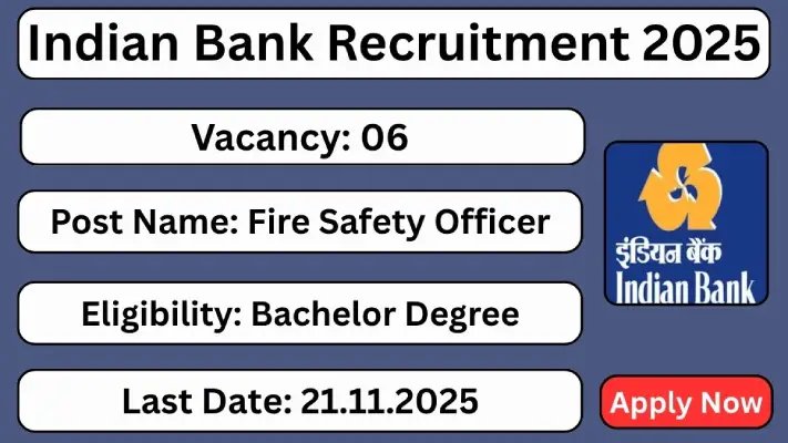 Indian Bank has released the recruitment notification to fill the 06 Fire Safety Officer Posts. The application form should be downloaded in PDF format from the official website @ https://indianbank.bank.in/. The last date for the receipt of Filled application along with all enclosures is 21.11.2025. Before submitting an application, candidates must carefully read the Indian Bank Fire Safety Officer 2025 notification and verify their eligibility.