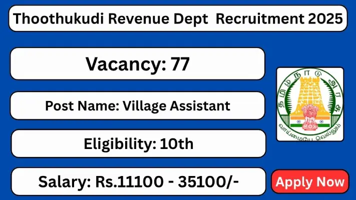 The Thoothukudi Revenue and Disaster Management Department has announced a recruitment drive for 77 Village Assistant (VA) posts. Interested and eligible candidates can apply offline through the official website https://Thoothukudi.nic.in/. Applicants must read the official notification carefully before submitting their applications.